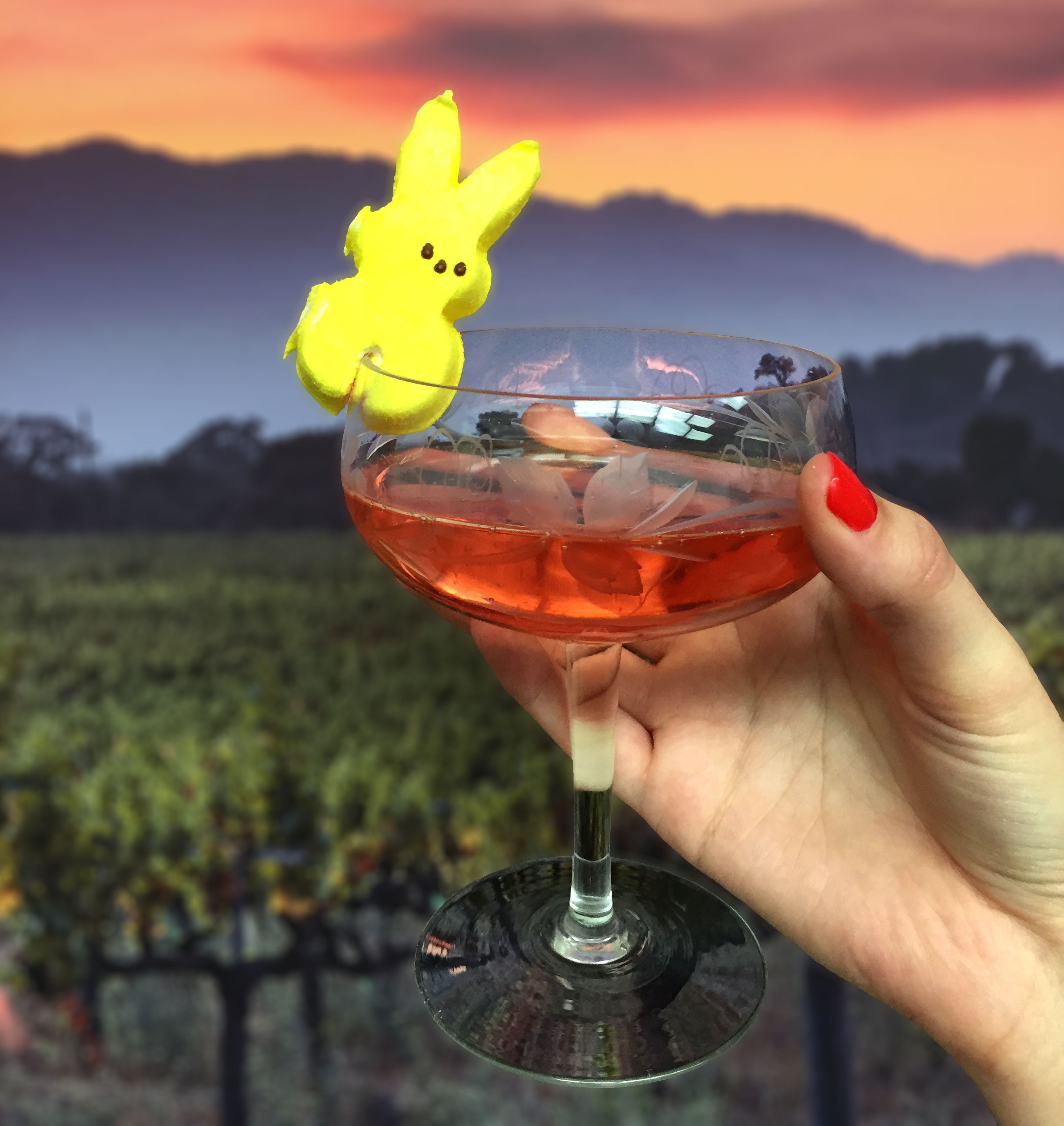 My favorite? A Peep garnish on a glass of pink champagne. And remember that one "serving" equals five Peeps, so drink (I mean eat) up!